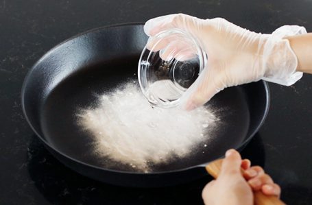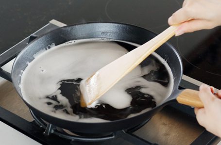1. Combine 1 tablespoon each of baking soda, vinegar, and mild dish soap in a small bowl and mix well to make a paste. Add to pan.