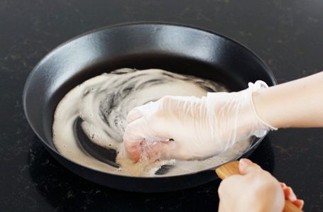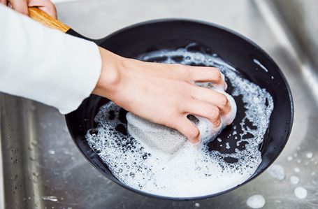 3. Gently scrub the pan with mild dish soap and a soft sponge.