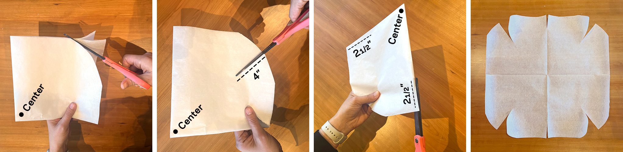 - Fold an 11” square parchment paper into quarters, cut as shown in the photos below, and place in the bottom of the pot.